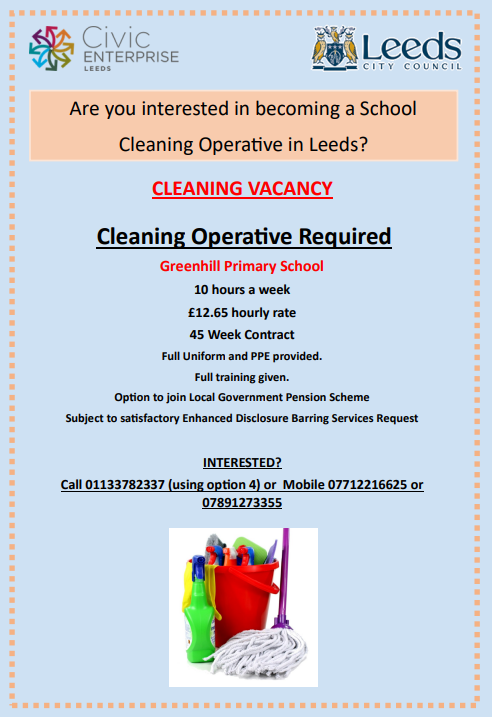 Greenhill Primary School is committed to safeguarding and promoting the welfare of children, young people and vulnerable adults and expects all staff and volunteers to share this commitment. We particularly welcome applications from under represented groups including ethnicity, gender, transgender, age, disability, sexual orientation or religion. The post is subject to a DBS check and satisfactory references.
